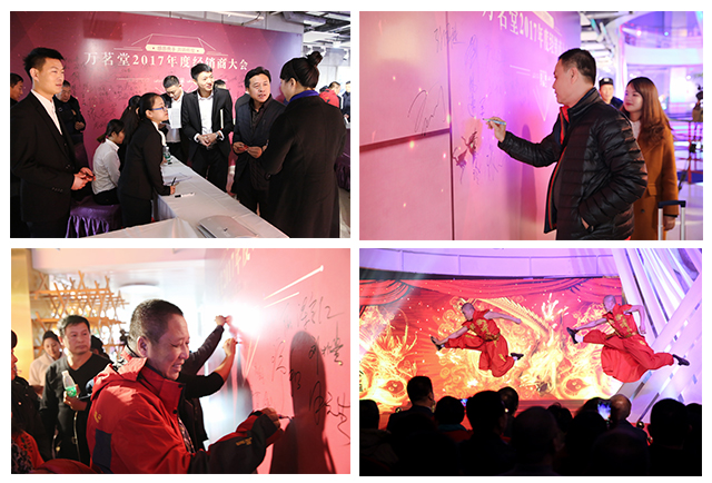 活动于下午一点开始,与会嘉宾陆续到场,签字并合影留念。伴随着开场节目《旗舞武术》的表演,万茗堂2017年度经销商大会正式拉开帷幕。