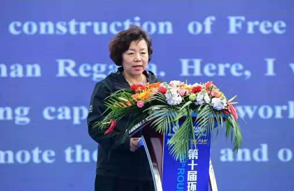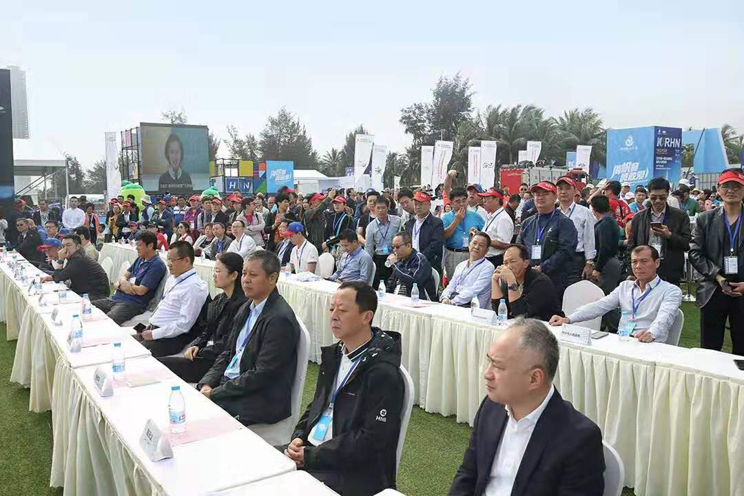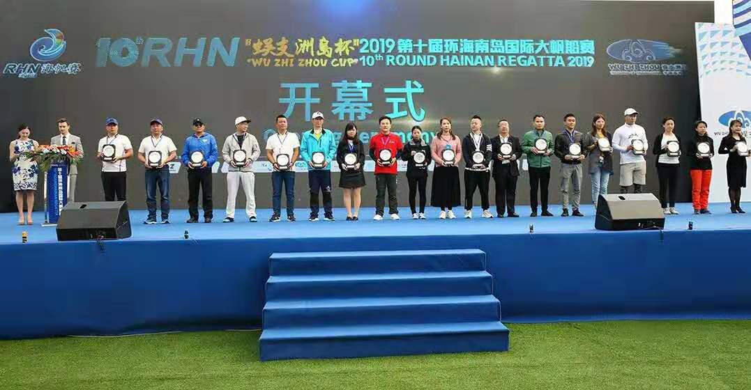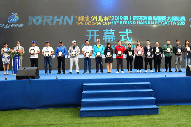 启动仪式由组委会副主任、执委会主任,省旅文厅厅长孙颖激情宣布:“蜈支洲岛杯”2019第十届环海南岛国际大帆船赛开幕!同时与中帆协主席张小冬、海口市政府市长丁晖、大赛仲裁主席安娜、总局装备中心副主任王平、省旅文厅副厅长高元义、大赛总冠名蜈支洲岛副总裁丁峰、大赛战略合作伙伴海南农信社副书记王绍文、海帆赛推广大使徐莉佳等共9位嘉宾共同鸣响气笛,为本届海帆赛揭幕。