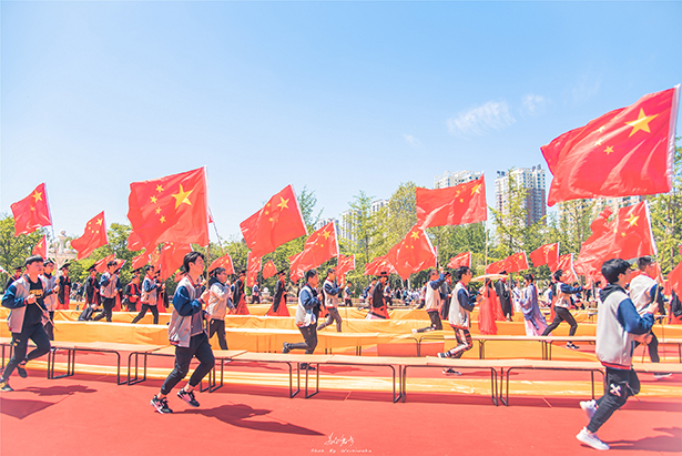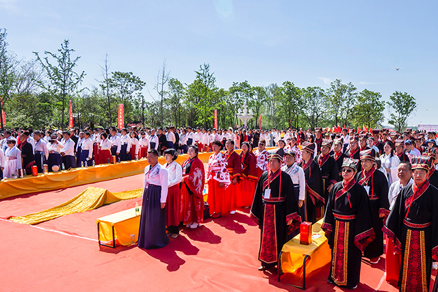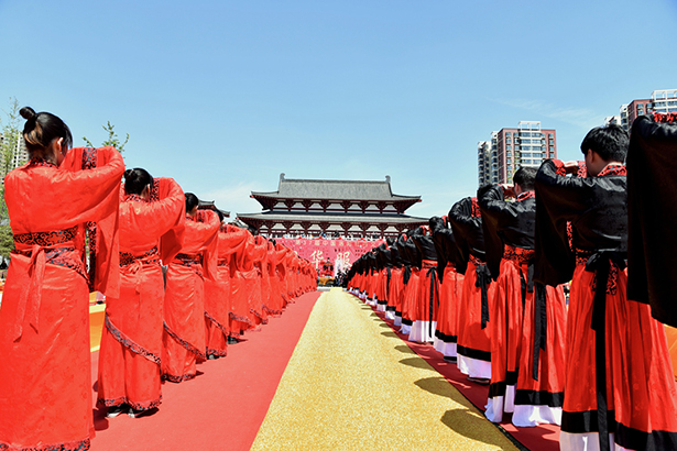 上午10:00整,随着持五星红旗的少年们活力登场,身着各式各样华服的嘉宾集体亮相,并组成华服方阵进行入城仪式,吸引所有在场观众的目光。众同袍整齐落座香案,场面恢弘壮观,华丽非凡。正式活动开始前,现场奏唱国歌,全场庄严肃立。