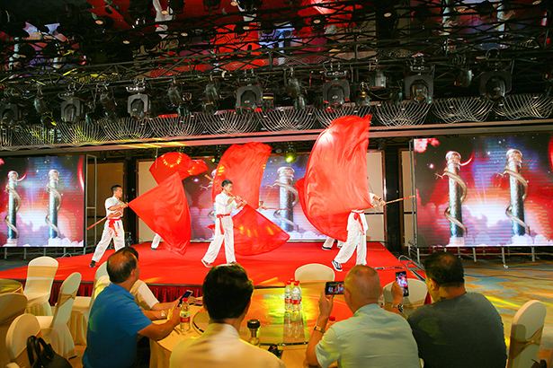 中国海军少将黄代培将军、宜宾五粮液系列酒有限公司真龙天子品牌运营负责人黄焱、万茗堂副总裁李庆伟上台致辞,对各位来宾和各界朋友表示热烈欢迎,并对天子酒民族龙给予高度评价。黄代培将军在致辞中表示,天子酒民族龙承载了华夏民族厚重的民族情怀,代表着拼搏进取、积极向上的民族精神,对激发国人的家国、民族情怀有很大的现实意义。时代的发展、国家的发展需要伟大的创造精神和民族精神的支撑,值此新中国成立70周年之际,天子酒民族龙以民族精神为内涵应运而生,“让我们以酒相庆,共同干杯!”精彩发言赢得热烈掌声。