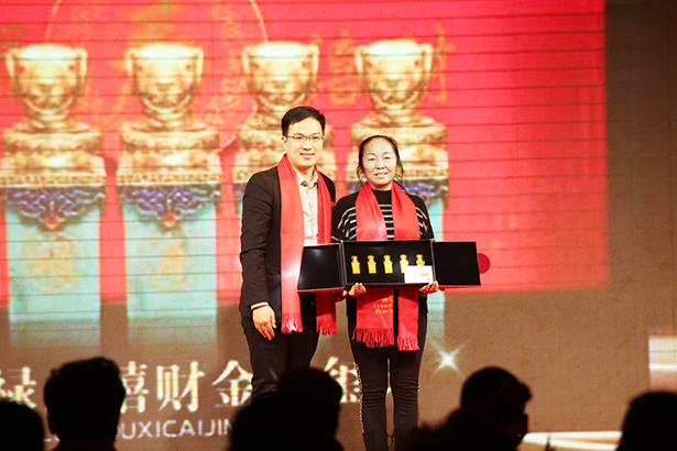 国家一级品酒师、万茗堂市场营销总监程煜(左)为优秀客户颁发价值2980元奖品《福禄寿喜财金玉玺印》