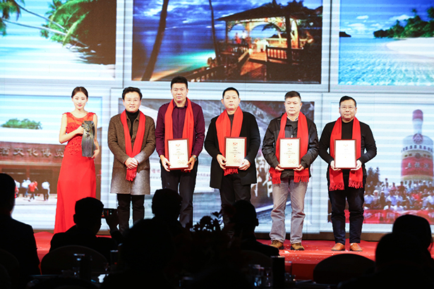 北京万茗堂商贸有限公司副总裁李庆伟(左二)为优秀客户颁发价值8800元奖品《鼎立羊年生肖雕塑瓷》
