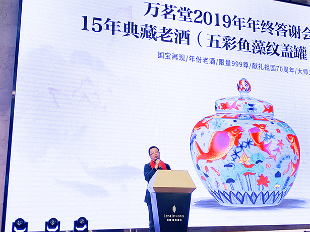2020年1月4日,万茗堂年终答谢会暨勇士的荣耀(15)典藏老酒(五彩鱼藻纹盖罐)新品首发仪式在广州隆重举行。中国工艺美术大师:汪明、贵州大学酿酒与食品学院生物工程系主任、仁怀市酱香酒品评协会专家:曹文涛、北京万茗堂商贸有限公司副总裁:李庆伟以及来自全国各地的万茗堂客户共赴盛会。在书画界、陶瓷界、白酒行业资深代表等嘉宾的见证下,勇士的荣耀(15)典藏老酒(五彩鱼藻纹盖罐)震世首发!这是一款将瓷文化、酒文化完美融合且意义重大的高端文化纪念酒,初次亮相便备受瞩目,多家媒体对此次活动进行详细报道。