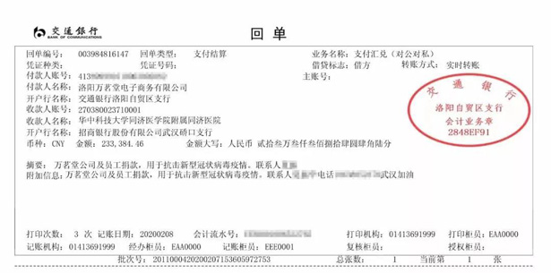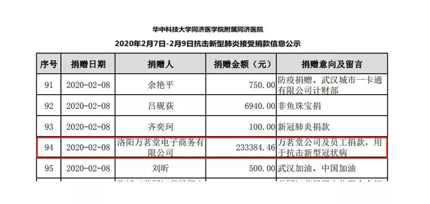 自2月6日发起“抗击疫情,支援武汉”爱心募捐以来,截止2月7日12时,共有835名万茗堂员工进行捐款。捐款总计77794.82元,公司捐款155589.64元,总计捐款金额233384.46元。鉴于武汉地区日益严峻的疫情防控形势,经研讨,万茗堂于2月8日将本次募捐款项233384.46元以现金的形式全部定向捐赠给武汉同济医院用于抗击疫情。近日,武汉同济医院官方捐赠已经公示,万茗堂爱心募款火速到位现已投入疫情防控物资购买使用。