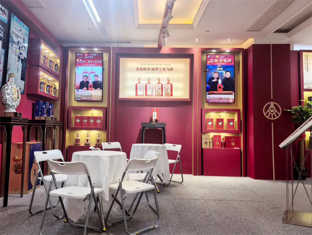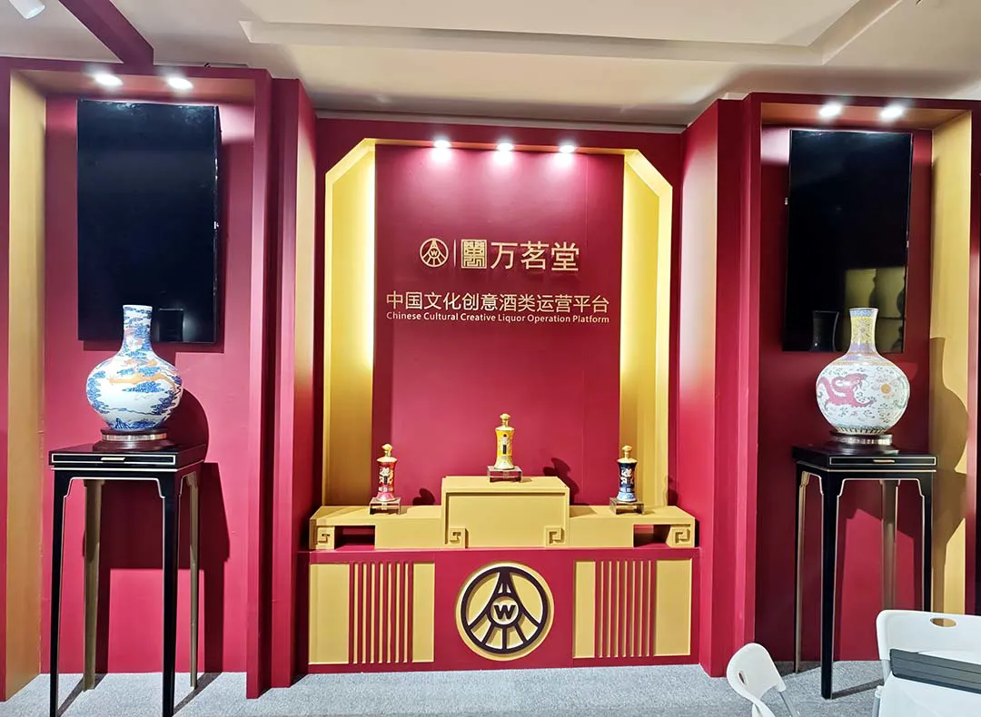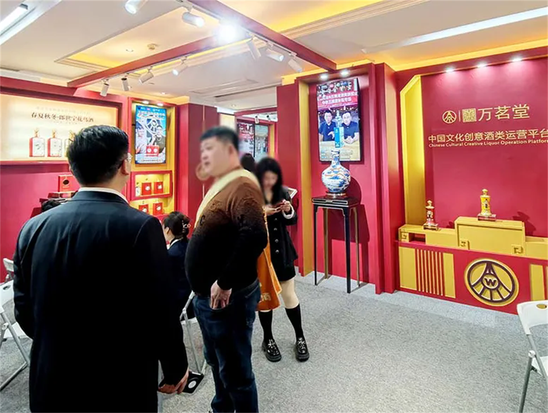 展厅内,五粮液股份真龙天子双龙戏珠天球瓶、真龙天子苍龙教子纪念酒、真龙天子吉庆双子瓶、真龙天子至尊龙邮纪念酒,以及五粮液股份春夏秋冬二十四节气酒、春夏秋冬十二金钗酒、春夏秋冬金山长城酒等,产品展示与装饰元素交相辉映,通过精致的布局和氛围营造出一种身临其境的沉浸感,独特的创意设计和深厚的文化气韵,吸引了众多观众驻足观赏,让大家对万茗堂的产品充满了更多的期待。