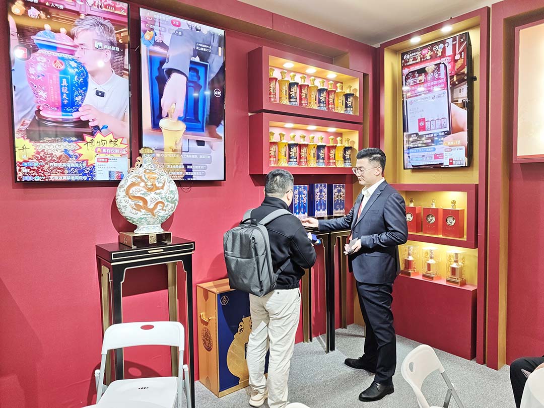 展会现场人气十足,前来洽谈、交流的酒商络绎不绝。值得一提的是,五粮液股份春夏秋冬二十四节气酒,其高端的形象、厚重的文化故事、卓越的口感,成为展会的一大亮点,吸引了众多酒商的关注目光。万茗堂工作人员热情地讲解产品背后的故事和文化渊源:从原料的选取到酿造工艺的把控,再到24节气文化的创新表达,每一个环节都凝聚了万茗堂对品质的追求、对文化的敬意和传承之心。