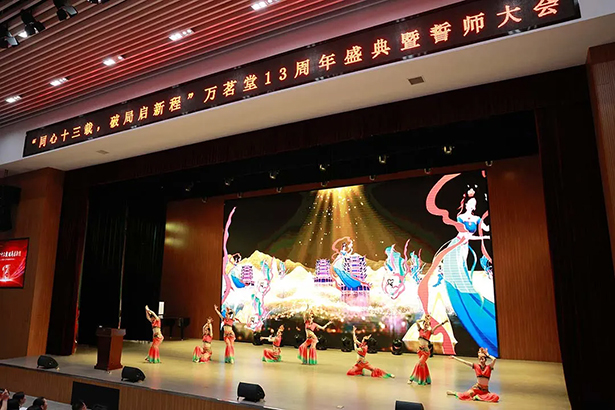 盛典在激昂的氛围中拉开帷幕。员工以团队为单位有序入场,礼堂大屏幕循环播放公司各团队精心录制的祝福视频,所有人笑容满面、朝气蓬勃,用真挚的话语诉说着对公司的热爱与感恩,白酒界、陶瓷界、书画界、文化界、广电媒体等社会各界人士和众多行业机构也纷纷发来生日贺电视频,表达着对万茗堂的美好祝福。舞蹈《敦煌》带领现场所有人进入一个神秘而瑰丽的世界。